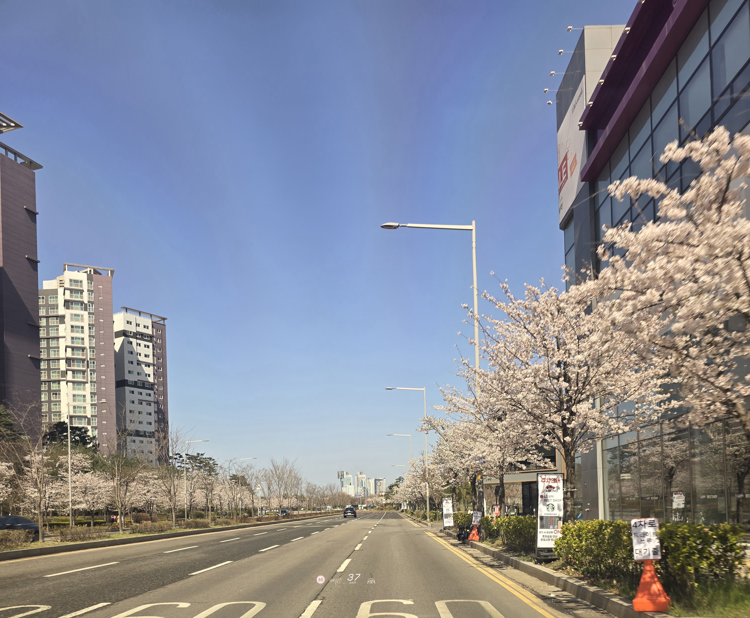 저희는 청라지구에서 출발해 국제대로를 따라 청라호수공원 방향으로 천천히 드라이브를 했어요. 도로 양 옆으로 벚꽃이 터널처럼 만개해 있어서 차 안에서도 마치 봄 영화의 한 장면에 들어온 듯한 기분이었답니다. 아이들도 “우와~ 예뻐!”라며 창밖을 바라보았고, 흩날리는 벚꽃잎에 어른들도 감탄했어요.