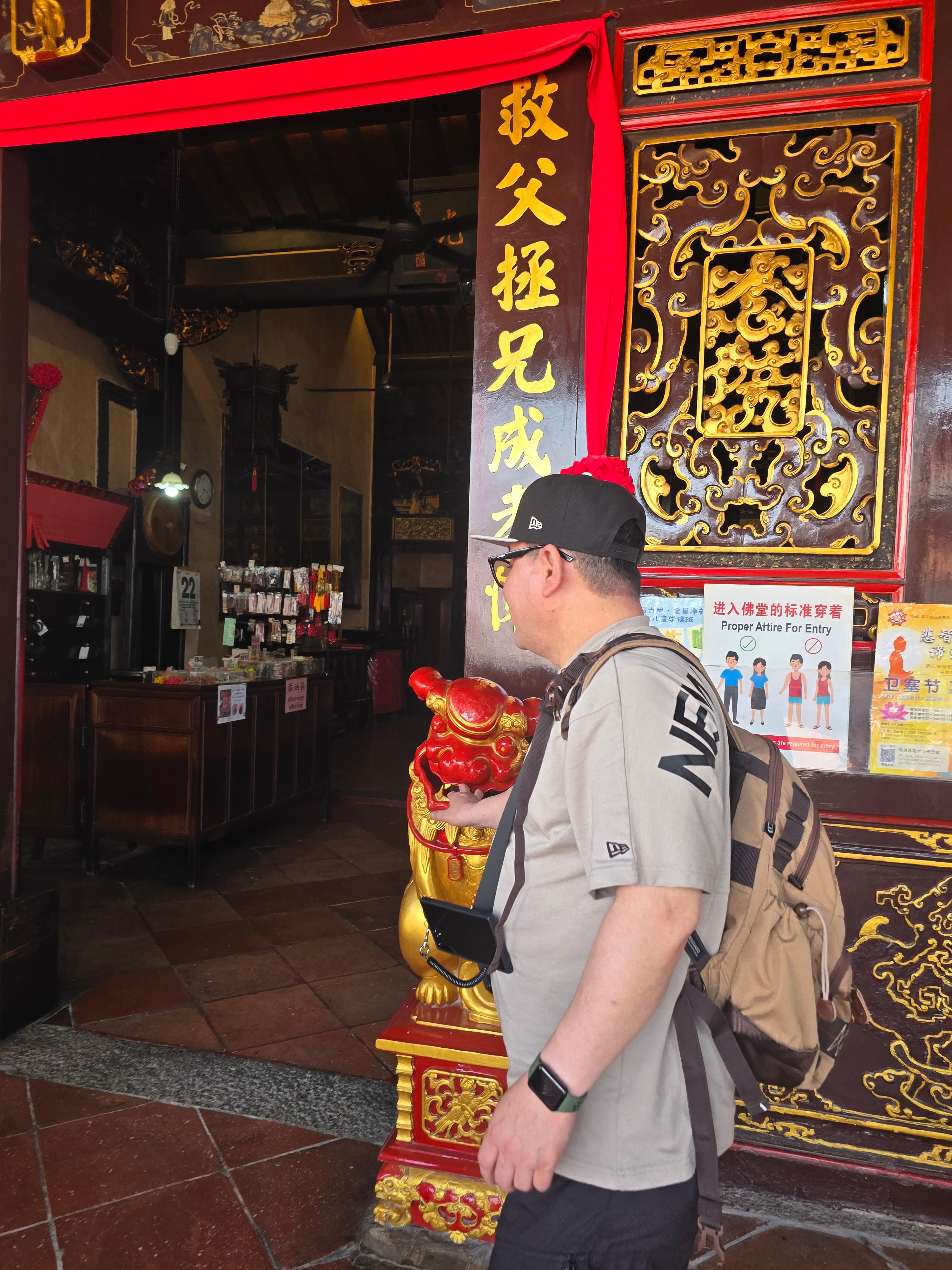 말레이시아에서 가장 오래된 중국 사원이었어요. 향 피우는 모습에 아이가 "이건 뭐야?" 궁금증 폭발! 🧒💕 붉은색 문양과 용 조각이 가득한 모습에 눈이 휘둥그레졌답니다 🐉🧧